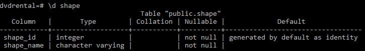 As you can see from the output, the shape_id column changed from GENERATED ALWAYS to GENERATED BY DEFAULT.
